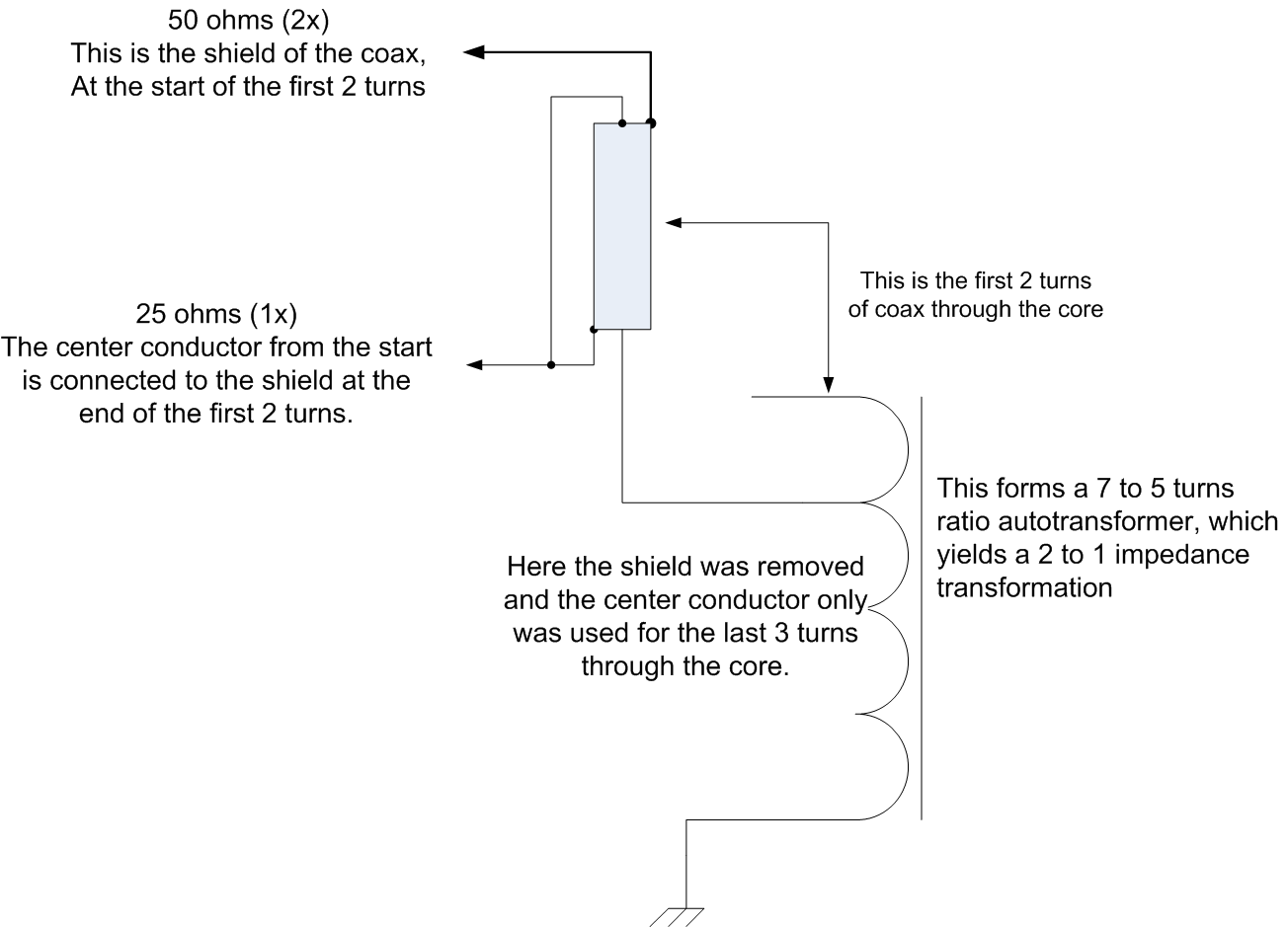 When I was trying to figure out how to do this, I got dizzy reading about all the various (and complex) methods, so for my own sanity, I decided to keep things as uncomplicated as possible. I need to give credit to Motorola application note AN749, where on page 5, figure 7B, there is a description of a basic hybrid coupler. The only drawback was the 2 to 1 impedance transformation, leaving one with a 25 ohm port to match back to 50 ohms somehow. But it turned out to be relatively easy to figure that one out; most broadband transformers convert impedances by the square of the turns ratio; for example, a 2 to 1 turns ratio will yield a 4 to 1 impedance transformation; a 3 turns to 1 yields a 9 to 1 ratio, and so on. OK, so for a 2 to 1 transformation, we need a turns ratio that is the square root of 2 (or 1.4142). Well, it turns out that a 5 to 7 turns ratio will yield a 1.4 transformation (close enough).