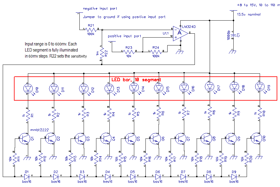 Here's a slick little peak-reading indicator. In my quest to find the right kind of meters for some of my projects, I became a bit frustrated with all the types and styles out there, the scarcity of exactly the correct ranges and scales, and the cost. Down East Microwave (DEMI) has a product offering that is a nice alternative...it's a LED bar graph display that uses a 20-pin LED package with 10 devices in it; the idea and basic design is credited to Dave (WW2R). In the DEMI display, the first few segments are green, the middle ones are yellow, and the last 2 or 3 are red; makes a nice eye-catching display. The LED bar component can be purchased from many suppliers in red, green, yellow, and the multi-color version, though that last one is a bit pricey in small quantities. Looking at the DEMI product, and being the curious sort, I thought I might like to try to make one; pretty silly, I admit, since their kit is reasonably priced. The first hurdle was finding the driving chips...most of the distributors I checked with listed them as a discontinued part with no stock, so I decided to design my own version using common discrete components. What I wound up with is the unit shown here; it's small...about 1.3 x 2.5 inches. As designed, it requires only 60 millivolts to light the first segment, with each additional segment fully illuminated in 60 mv steps. As each segment approaches full brightness, the next segment begins to illuminate, allowing for some in-between interpretation. Full scale requires 600 millivolts input, though the gain of the driving chip can be set to make it more (or less) sensitive. It will accept either a positive or a negative input signal, and runs on anything from 8 to 15v at 10 to 110 ma. I'm using two of them on one of my amplifiers to monitor forward and reflected power. Power meters are always suspect in accuracy (they are only as accurate as the detectors feeding them), so a relative indicator like this one was an easy choice. RF doesn't bother it at all, even at the KW level. A builder can mount it into a panel in the vertical or horizontal using the two mounting holes provided, or as in the case of the amplifier referenced above, mount it to a support bracket located just behind the panel. It's a bit of a chore to cut a rectangular hole to position the face of the bar display flush into a panel, but worth the effort to do so. The basic design idea I had was to use a diode to step the LED segments apart from one another. A diode drops about the same amount of voltage across it's junction as a transistor does from emitter-to-base (which is a diode itself), making it a good sequencing component. The diode feeds a transistor switch, which turns on it's individual LED segment. By placing 9 diodes in series after the first transistor switch, each segment illuminates in step, following the input voltage ramp. The only other thing to do was to drive all of this with an opamp, which can be varied in gain for more or less sensitivity, and will accept a negative signal on it's inverting input, or a positive signal on it's non-inverting input. Almost any diode, transistor, or op-amp can be used in this design; I chose the ones I use the most...bas16 diodes, mmbt2222 transistors, and an LM324 opamp (this is a quad opamp, but only one of the 4 individual units is used). If you are able to make your own PC boards, the artwork for this is here. The schematic is shown below.