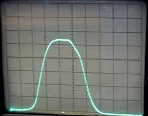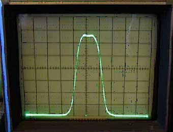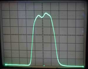 Here's an example of one of the 1080 MHz filters experimented with. The scope image is a linear display of the pass-band response, swept from 880 to 1280 MHz. There is a slightly flattened peak with steep slopes on either side, indicating optimum coupling. This was achieved with careful adjustment of the spacing between the filter elements. Getting the spacing too close (bottom left) or too wide (bottom right) will over-couple or under-couple the filter, producing double-peaks, broader or narrower responses, and higher Insertion losses than necessary. The Q of the PC board material also affects the performance of