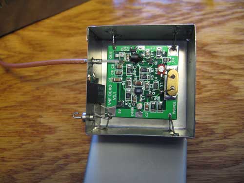 Suspended into the dead air space of the box, the board is secured to the sides using solid wires soldered to the corners as shown (it doesn't look securely fastened, but it really is). This was done to minimize heat loss into the enclosure. As an alternative mounting method, there are two 1/8" mounting holes in the board for use with 4-40 hardware. A TO-220 regulator chip, tab soldered to the inside of the box (left wall), is supplied 12v from a feed-through capacitor, and delivers the recommended 8v to the board. The output coax passes through a small hole drilled into the