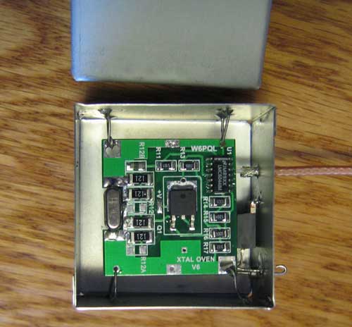 resistor (RL) was not used. Removing the cover on the other side reveals the temperature controller side of the board. Once the entire assembly has been tested, an access hole can be drilled into the lid covering the oscillator side (for adjustment of the frequency net trimmer), and both lids can be secured by spot-soldering to the enclosure. For installing the completed box into other equipment, I used a couple of solder lugs soldered to the enclosure (as shown in the first picture at the top of the page). This is just one example of an "economical" enclosure...a small aluminum box, or other product (such as a die-cast box or a brass box) will work just as well. The whole thing measures 1.75" x 1.75" x 1" tall as shown, and could be made smaller if necessary. Detailed assembly instructions can be viewed here: |
