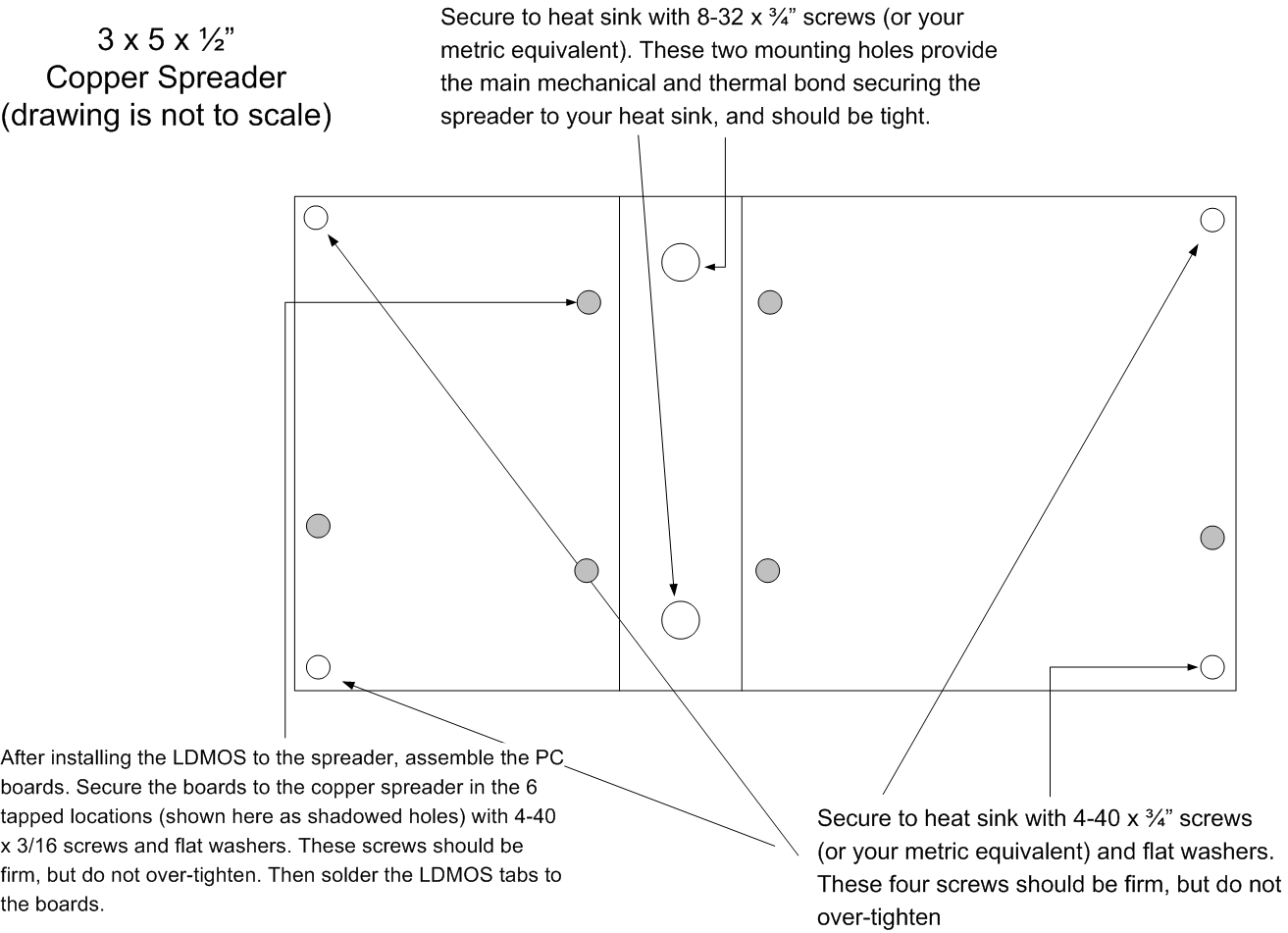 Secure the boards to the spreader with 4-40 x 3/16 screws and flat washers. Do not over-tighten. This older photo shows 10 screws, but 4 of the screws (the outer two pairs near the LDMOS trench) are not used on this amplifier.