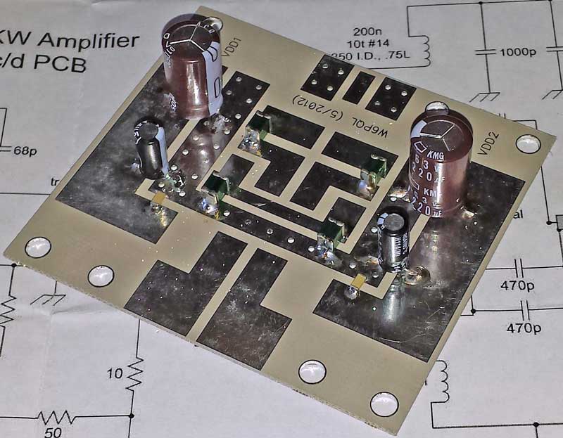 The 470pf MC18 capacitors are installed in pairs at the four locations shown. Mounting them on their thin edge helps to balance the currents in the pairs.