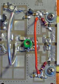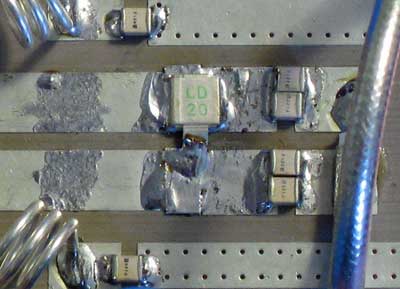 matching. Here's another change I made, which brought the output up to 580w. The schematic in the Dubus article showed the bias feed connected in such a way that only half the transistor (it's a push-pull unit) was biased on; the opposite side was almost on, but was essentially still class C, not drawing any idling current. This unbalances the circuit, and may even account for some of the lower IMD numbers in the KW version of the tests (23db) as described in the magazine article; this is only speculation on my part, I did not make IMD measurements myself. The fix was an easy one; just jumper the two gate decoupling pads