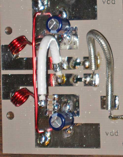 two halves of the device, resulting in higher output power. What we are doing here is connecting the grounded shield of the rg402 output balun to the top transistor output. On the input side, the grounded shield should be connected to the bottom transistor (it is connected correctly as shown above). The Dubus article had this output connection reversed, and I missed it completely; however, Fred (WA7TZY), who worked on this type of amplifier in the commercial world, caught it right away as he was assembling his kit. Initially, I had some odd stability issues with the amp; on some antennas, it was fine, but connected to others it would show some instability; I just attributed it to the very high low frequency gain of the device. To solve this, I added a small inductor across the gates of the device to kill the low frequency gain, and this is still a good idea. However, the root cause of this "sometimes unstable" problem was the output balun connection error. If you already assembled your kit, it may be easier to reverse