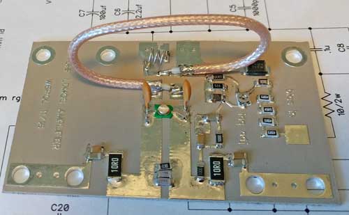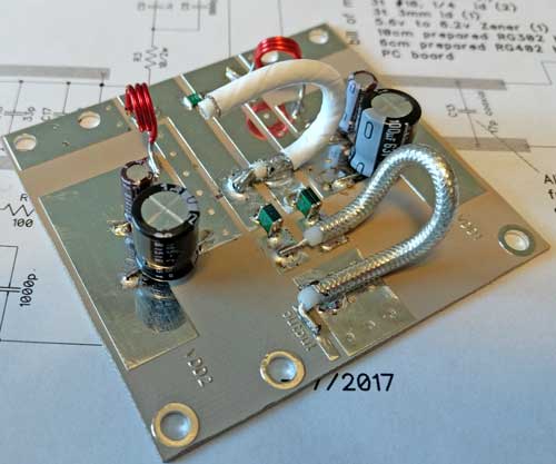 Leaving the input coaxial balun for last, mount the input board parts. The small green trimmer must be mounted so it is not centered between the two gate traces, it must be offset so the round part in the center does not sit above the opposite trace. If centered, it will short the two traces together. Pre-align the adjustment slot on the trimmer to mid-range (it is set to mid-range in the photo).
