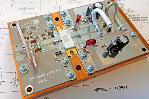 In this last assembly step, slide the boards under the transistor tabs (transistor should have been previously flow-soldered to a copper spreader). The gate tabs were trimmed a bit before the transistor was mounted to provide clearance for C16 and C17.