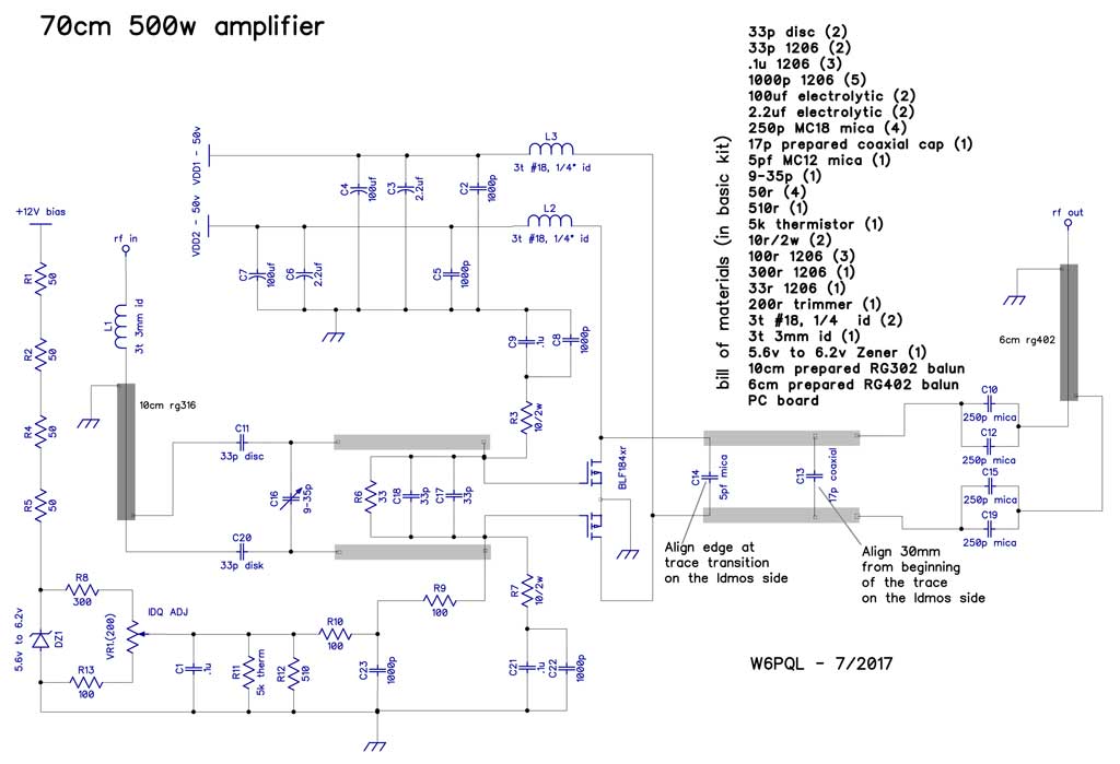 Turn on the bias and note the idling current drawn from the 50v supply. Adjust IDQ for 1 amp. Note: the current drawn by the bias supply (usually12v) is not what you are measuring here...you must measure the idling current (IDQ) the LDMOS draws from the 50v supply.